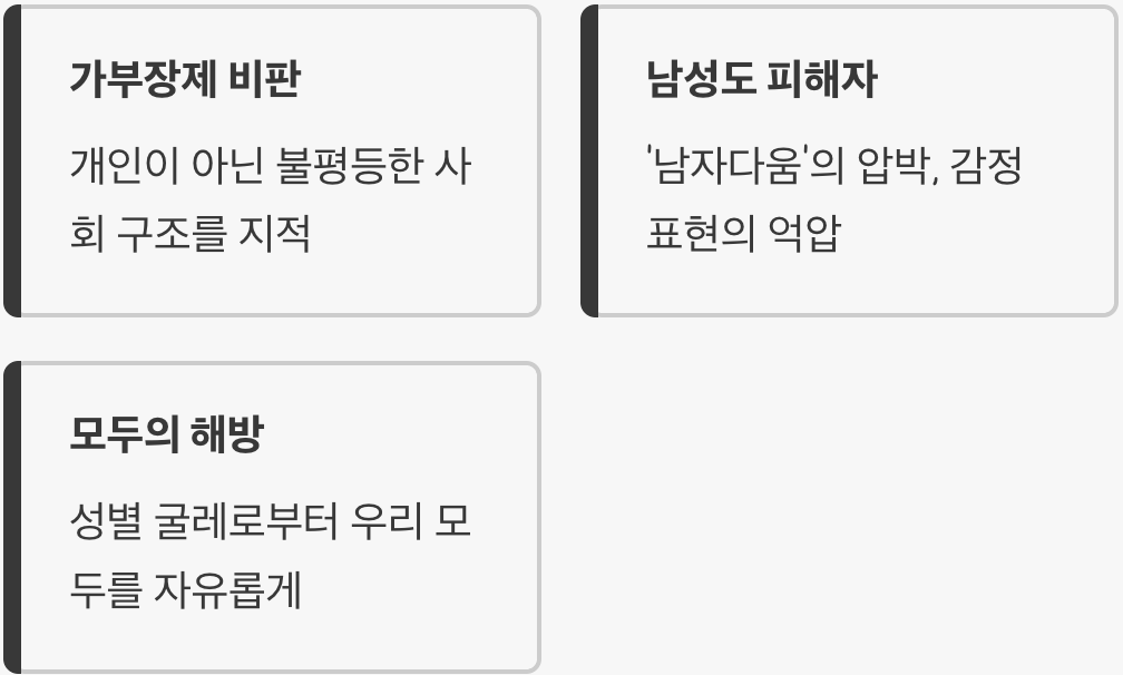오히려 이 낡은 틀은 남성들에게도 족쇄가 됩니다. ‘남자는 울면 안 된다’, ‘가족의 생계는 남자가 책임져야 한다’는 사회적 압박감 속에서, 남성들 역시 자신을 자유롭게 표현할 기회를 박탈당해 왔습니다. 이처럼 페미니즘은 남성과 여성을 대립시키는 것이 아닌, ‘성별’이라는 낡은 굴레로부터 우리 모두를 해방시키는 것을 목표로 합니다.