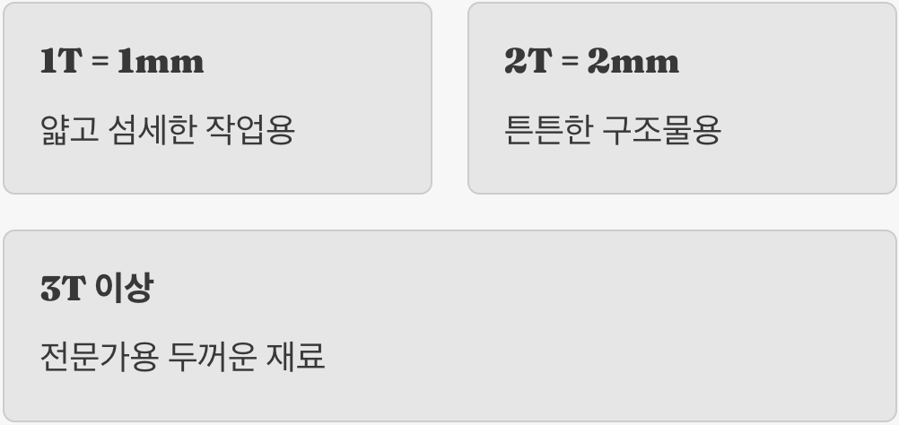 하드보드지를 인터넷으로 사거나 자세히 들여다보면 '1T', '2T' 같은 암호 같은 글자가 적혀 있는 것을 볼 수 있습니다. 여기서 알파벳 T는 두께(Thickness)를 뜻하는 말로, 그 앞에 있는 숫자가 곧 밀리미터(mm) 단위라고 생각하면 이해하기 쉽습니다. 즉 1T는 1mm, 2T는 2mm 두께라는 뜻입니다.