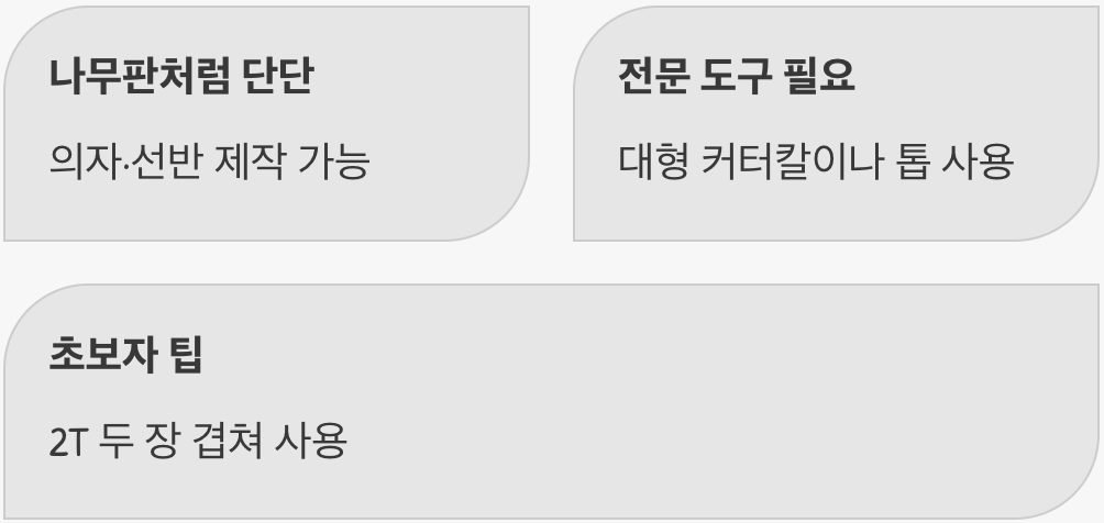 하지만 2T는 생각보다 단단해서 한 번의 칼질로 자르려고 하면 절대 안 됩니다. 욕심내서 힘을 주면 칼날이 부러지거나 손을 다칠 위험이 큽니다. 칼을 가볍게 쥐고 같은 자리를 3번에서 4번 정도 지나간다는 느낌으로 여러 번 그어주는 것이 요령입니다. 이렇게 하면 힘도 덜 들고 자른 면도 훨씬 매끄럽게 완성할 수 있습니다.