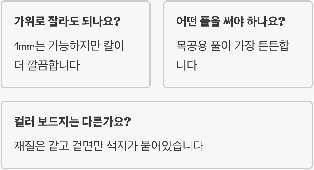 A. 검은색, 흰색 등 색상이 입혀진 '컬러 하드보드지'도 내부는 일반적인 회색 보드지와 재질이 같습니다. 겉면에 색지가 붙어있어 따로 색칠할 필요가 없어 편리하죠. 다만 단면을 자르면 속의 회색 종이가 보일 수 있으니, 이 부분이 싫다면 자른 면을 매직이나 물감으로 칠해주는 센스가 필요합니다.