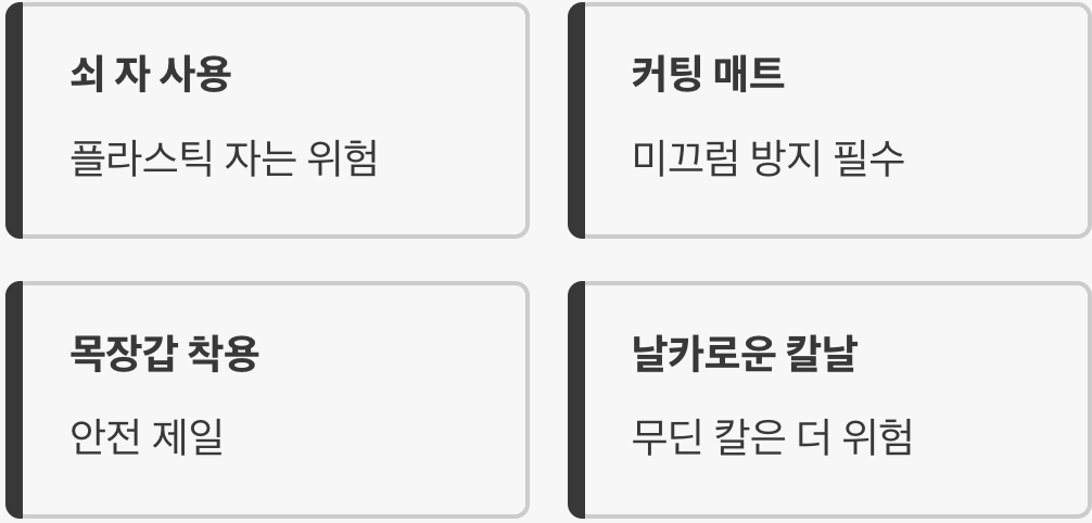 칼을 잡지 않은 손에는 목장갑을 끼는 것이 좋습니다. 그리고 칼질을 할 때는 내 몸쪽으로 당기지 말고, 팔 전체를 이용해서 위에서 아래로 긋듯이 힘을 써야 합니다. 칼날이 무뎌졌다면 아끼지 말고 바로 뚝 끊어서 새 날을 사용하세요. 날이 서지 않은 칼로 억지로 두꺼운 종이를 자르려다가는 힘이 과하게 들어가 사고가 날 수 있으니, 항상 날카로운 상태를 유지하는 것이 안전의 핵심입니다.