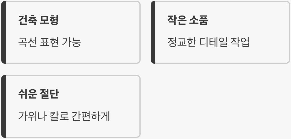 건축 모형을 만들거나 곡선이 들어가는 부드러운 표현이 필요할 때는 1mm 두께인 1T 보드지를 추천합니다. 이 두께는 힘이 약한 어린 친구들도 비교적 쉽게 자를 수 있고, 손으로 살살 구부리면 부러지지 않고 휘어지는 성질이 있어 곡면을 표현하기에 아주 적합합니다. 가위로도 자를 수는 있지만, 깔끔한 단면을 위해서는 칼을 사용하는 것이 좋습니다.