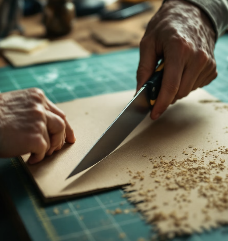 마지막으로 두께만큼 중요한 것이 바로 자르는 도구입니다. 하드보드지를 자를 때는 플라스틱 자보다는 반드시 쇠로 된 자(스틸자)를 사용해야 합니다. 플라스틱 자는 칼날에 깎여나갈 수 있어 위험하고, 자가 망가지면 선도 삐뚤어지게 됩니다. 또한 바닥에는 반드시 고무로 된 커팅 매트를 깔아주어야 칼날이 미끄러지지 않고 안전합니다.