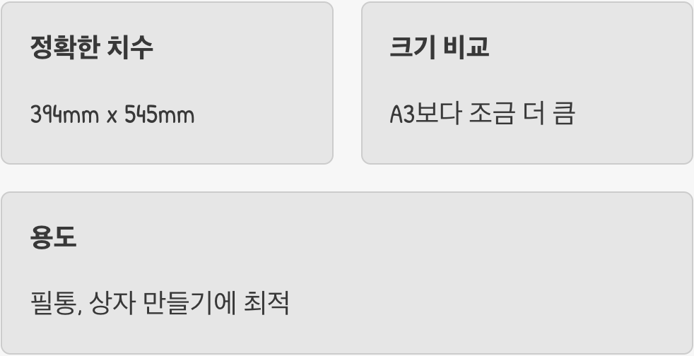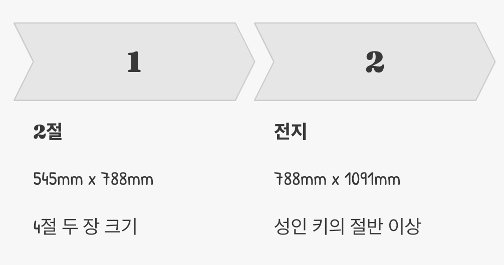이런 큰 사이즈는 대형 게시판을 꾸미거나 사람이 들어갈 만한 큰 구조물을 만들 때 사용합니다. 일반적인 문구점에는 재고가 없는 경우가 많아 큰 화방에 가야 구할 수 있습니다. 만약 큰 사이즈를 사야 한다면 반드시 차를 가져가거나, 돌돌 말 수 없으니 큰 화구통이 아닌 넓은 판을 덧대어 가져갈 준비를 해야 종이가 꺾이는 참사를 막을 수 있습니다.