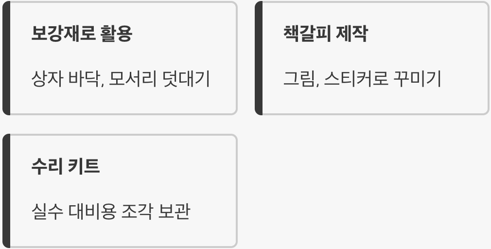 원하는 것을 만들고 나면 애매하게 남는 자투리 하드보드지가 생기기 마련입니다. 그냥 버리기에는 아깝고 두기도 지저분하죠. 이럴 때는 자투리들을 모아서 작은 칸막이나 보강재로 활용해 보세요. 만들고 있는 상자의 바닥이나 모서리에 덧대어 주면 훨씬 튼튼한 작품이 됩니다.