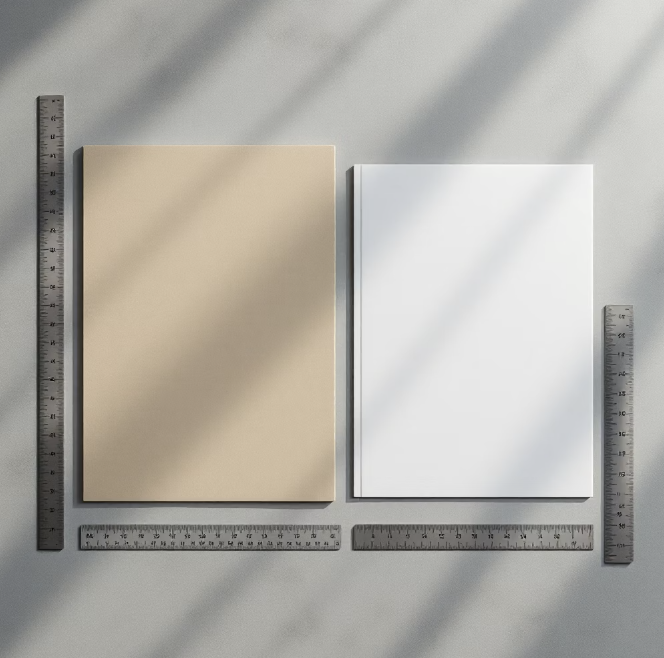 A. 기본적으로 흰색이나 회색 하드보드지와 컬러 하드보드지의 규격은 동일합니다. 4절, 2절 등 호칭이 같다면 크기도 같습니다. 다만, 제조사나 브랜드에 따라 5mm 내외의 미세한 차이는 있을 수 있으니 정밀한 작업 전에는 꼭 직접 자로 재보는 것이 좋습니다.