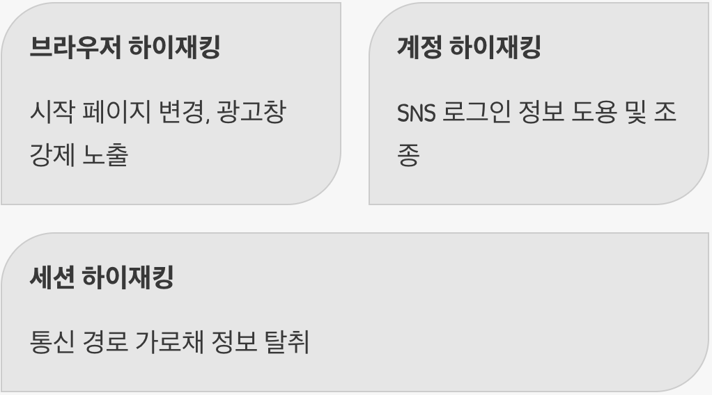 이 외에도 다른 사람의 로그인 정보를 훔쳐 SNS 계정을 마음대로 조종하는 ‘계정 하이재킹’, 인터넷 통신 경로를 가로채 정보를 빼내는 ‘세션 하이재킹’ 등 다양한 사이버 범죄에 이 용어가 쓰이고 있습니다. 비록 대상은 달라졌지만, ‘주인의 허락 없이 통제권을 강제로 빼앗는다’는 본질적인 의미는 그대로 유지되고 있는 셈입니다.