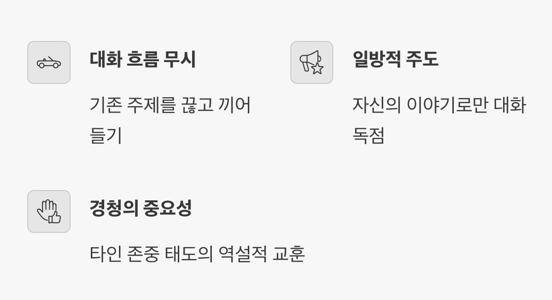 이처럼 기존 대화의 주제나 흐름을 무시하고, 자신의 이야기로 주도권을 완전히 빼앗아 오는 행위를 바로 ‘대화 하이재킹’이라고 부릅니다. 이는 다른 사람의 말을 경청하고 존중하는 태도가 얼마나 중요한지를 역설적으로 보여주는, 아주 현대적인 의미의 쓰임새라고 할 수 있습니다.