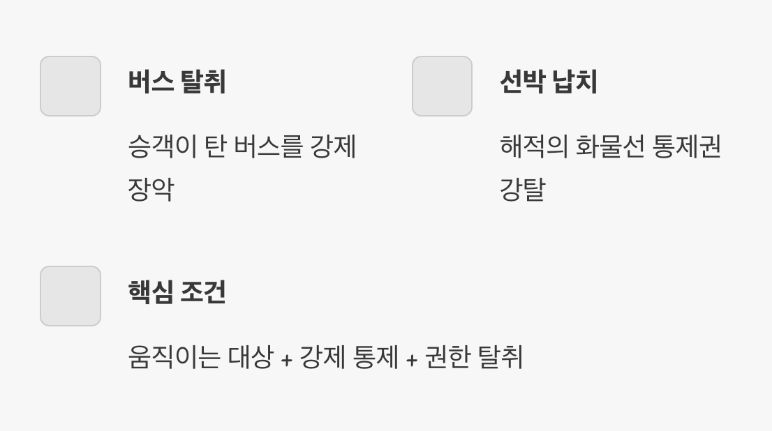 즉, 이 행위의 핵심은 ‘움직이고 있는’ 대상을 ‘강제로’ 멈추거나 경로를 바꾸게 하여 ‘통제권을 빼앗는’ 것입니다. 어떤 종류의 운송 수단이든 이 세 가지 조건에 해당한다면 모두 이 용어로 설명할 수 있습니다.