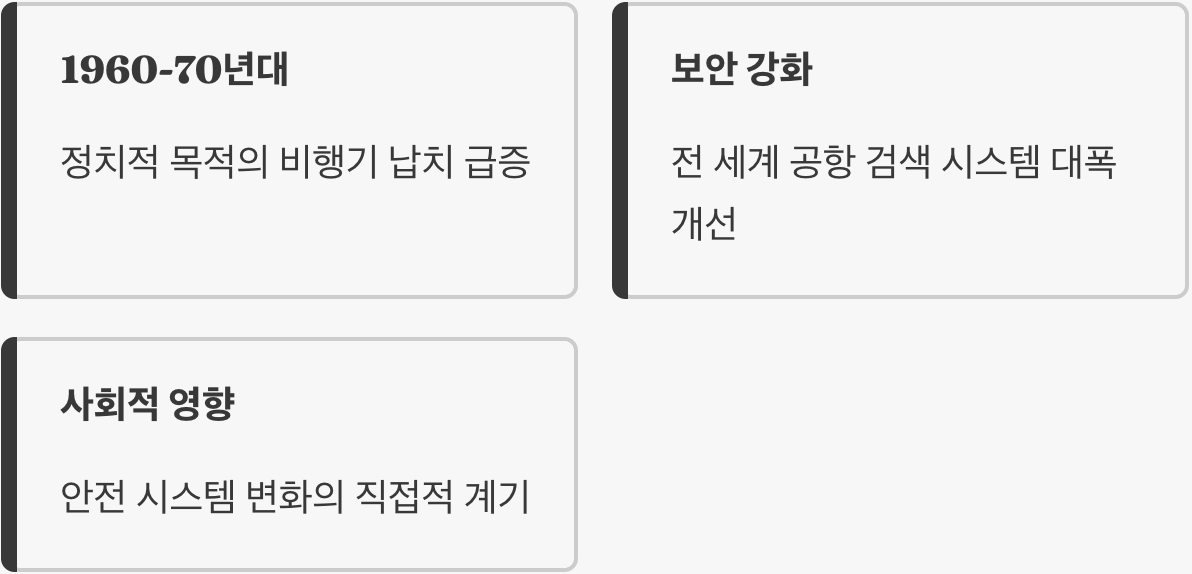 이러한 항공기 대상 범죄는 수많은 인명 피해와 공포를 낳았고, 이는 곧 전 세계 공항의 보안 검색이 대폭 강화되는 직접적인 계기가 되었습니다. 이처럼 이 단어는 단순한 사건을 넘어, 우리의 안전과 직결된 사회 시스템의 변화까지 이끌어낸 중요한 의미를 담고 있습니다.