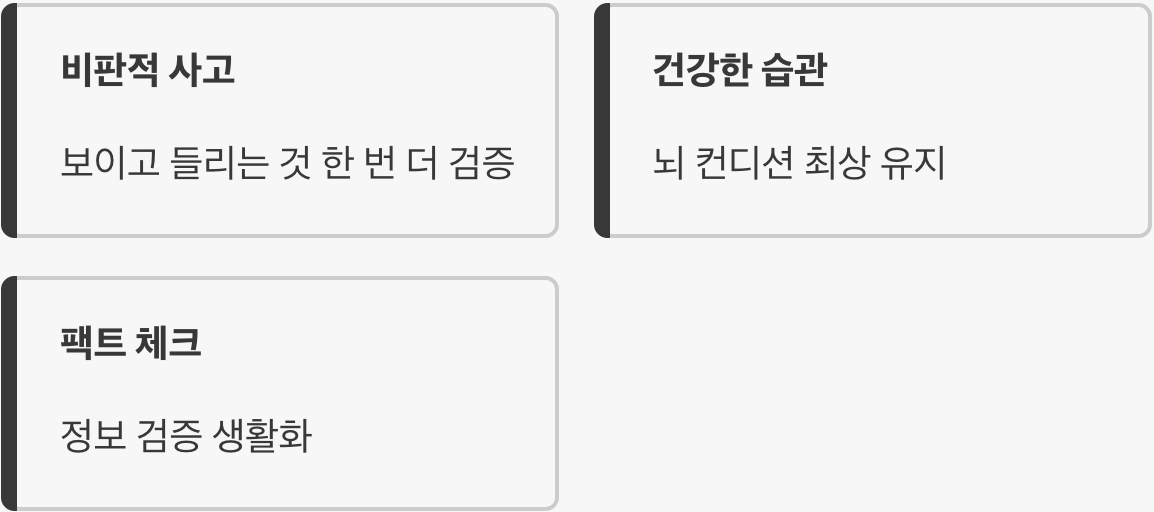 건강한 생활 습관으로 뇌의 컨디션을 최상으로 유지하고, 디지털 정보를 대할 때는 팩트 체크를 생활화하는 것. 이것이야말로 복잡한 세상에서 흔들리지 않고 중심을 잡으며 살아가는 가장 지혜로운 생존 전략이자 해결책이 될 것입니다. 현실을 직시하는 맑은 정신이 여러분을 지켜줄 것입니다.