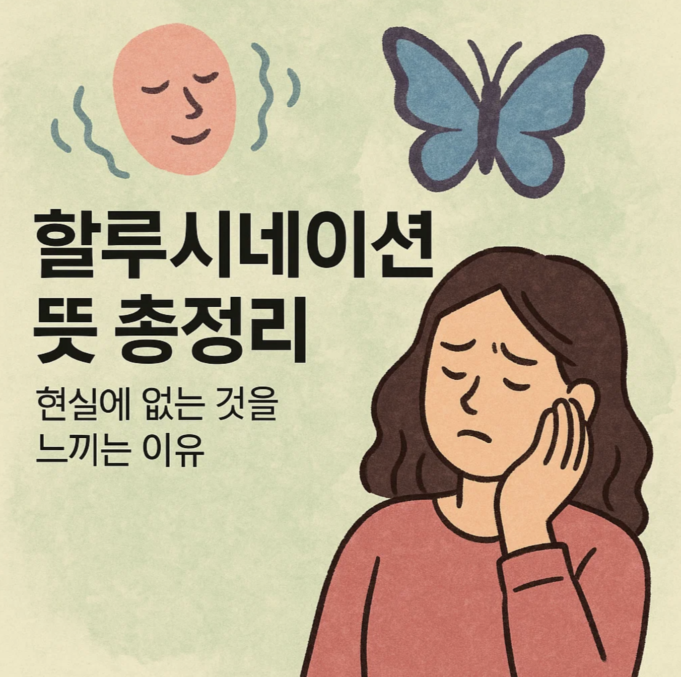 할루시네이션은 의학적으로 ‘환각’을 의미합니다. 외부에서 들어오는 자극이 전혀 없는데도 소리를 듣거나, 형상을 보거나, 냄새를 맡는 등 실제처럼 감각을 느끼는 증상입니다. 우리 뇌는 눈이나 귀를 통해 들어온 정보를 해석해서 현실을 인식하는데, 피로가 극심하거나 특정 질환이 있을 때 뇌의 신경전달물질에 불균형이 생기면 뇌가 스스로 없는 정보를 만들어내게 됩니다.