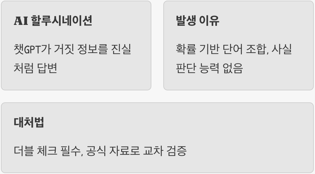 A. 현재 기술로는 완전히 없애기는 어렵습니다. AI는 확률을 기반으로 문장을 생성하는 구조이기 때문입니다. 하지만 질문을 구체적으로 하거나, "출처를 함께 표시해줘", "확실하지 않으면 모른다고 해줘"라고 명령어를 입력하면 엉뚱한 답변을 줄이는 데 도움이 됩니다.
