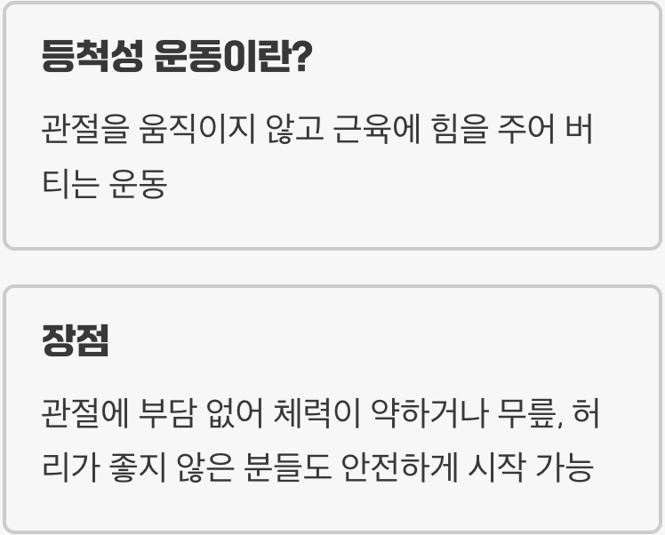 벽을 밀거나, 플랭크 자세로 버티거나, 무거운 장바구니를 들고 가만히 있는 모든 순간이 바로 등척성 운동입니다. 이 운동의 가장 큰 장점은 관절에 거의 부담을 주지 않아, 체력이 약하거나 무릎, 허리가 좋지 않은 분들도 안전하게 시작할 수 있다는 점입니다. 이 안전함이야말로 꾸준한 실천을 가능하게 하는 첫 번째 해결책입니다.