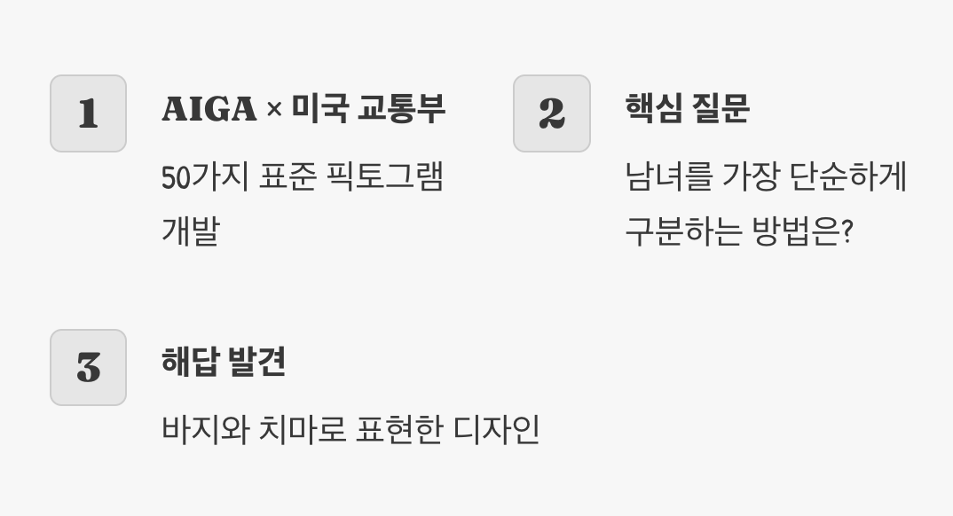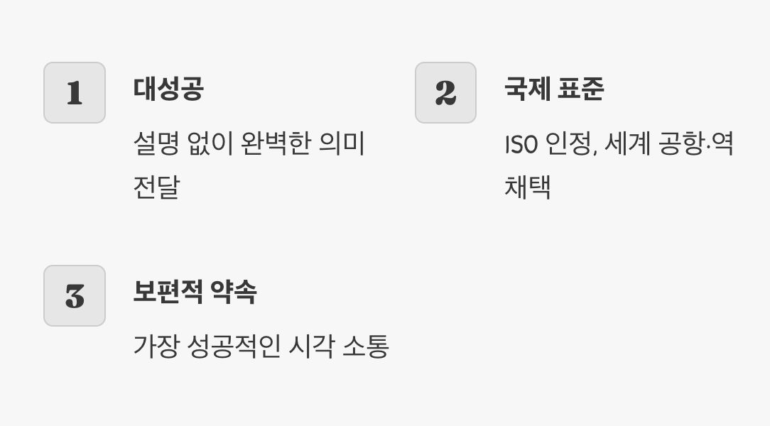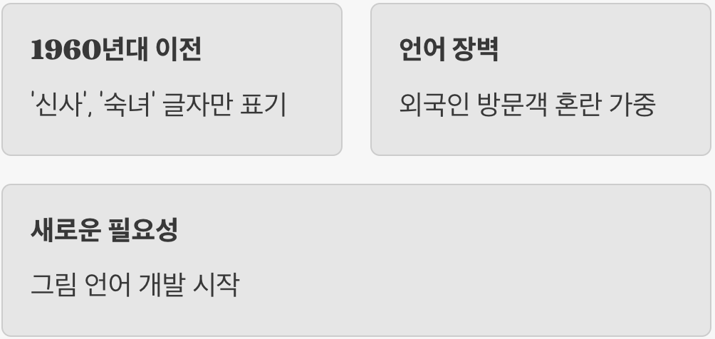 1960년대에 들어서며 해외여행이 점차 대중화되고, 올림픽이나 박람회 같은 대규모 국제 행사가 열리면서 큰 혼란이 생겼습니다. 영어를 모르는 사람이 미국 공항에, 프랑스어를 모르는 사람이 파리역에 내렸을 때, 화장실 문 앞에 쓰인 글자만으로는 어느 문으로 들어가야 할지 도통 알 길이 없었던 것입니다. 이 불편함이 바로 새로운 소통 방식의 필요성을 일깨운 출발점이었습니다.