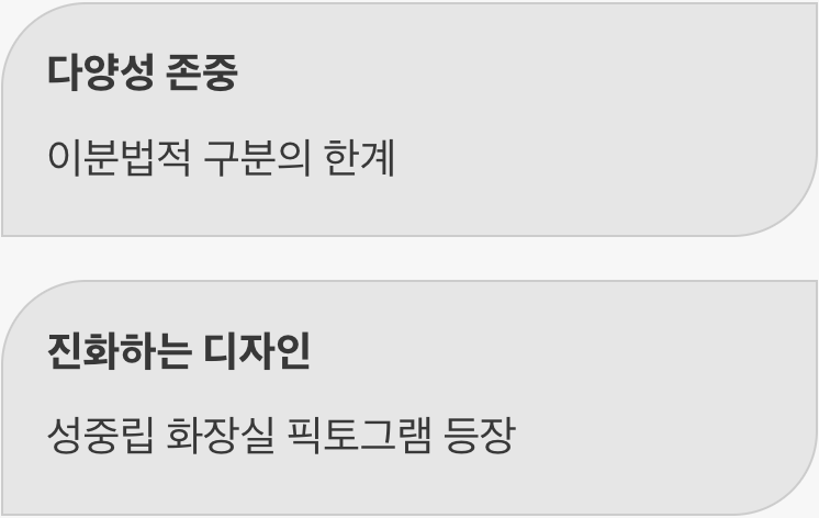 이러한 고민 속에서 최근에는 치마와 바지를 반반씩 합친 모양이나, 성별 구분 없이 사람 모양 하나만 그려 넣은 ‘모두의 화장실(All Gender Restroom)’ 픽토그램도 속속 등장하고 있습니다. 이처럼 가장 보편적이라 믿었던 화장실 그림문자의 변화는, 우리가 서로를 이해하고 존중하는 방식이 어떻게 발전하고 있는지를 보여주는 흥미로운 거울과도 같습니다.