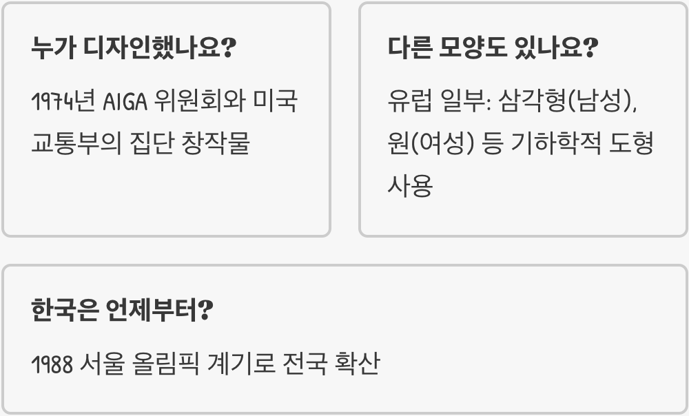 A. 우리나라 역시 1988년 서울 올림픽을 개최하면서 국제적인 기준에 맞춘 픽토그램 시스템을 본격적으로 도입하고 정비하기 시작했습니다. 이를 계기로 ‘치마와 바지’ 형태의 화장실 픽토그램이 전국 공공시설에 널리 퍼지게 되었습니다.