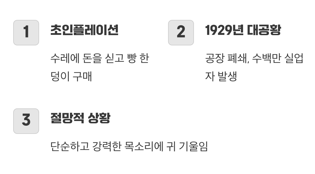 여기에 1929년 전 세계를 강타한 ‘대공황’은 꺼져가던 불씨에 기름을 부었습니다. 공장은 문을 닫고, 수백만 명의 실업자가 거리로 쏟아져 나왔습니다. 당장 내일 먹을 것을 걱정해야 하는 절망적인 상황 속에서, 사람들은 복잡한 민주주의 절차보다 “나를 따르라, 그러면 모두에게 빵과 일자리를 주겠다!”고 외치는 단순하고 강력한 목소리에 귀를 기울이기 시작했습니다.