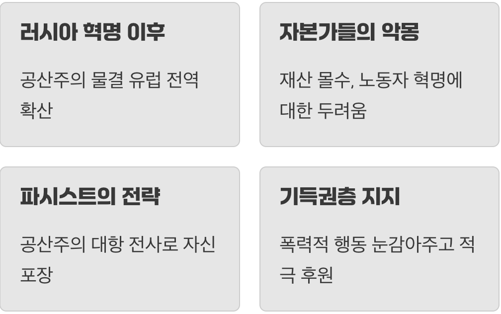 당시 유럽에는 또 하나의 거대한 그림자가 드리우고 있었습니다. 바로 러시아 혁명 성공 이후 무섭게 번져나가던 ‘공산주의’의 물결입니다. 노동자들이 혁명을 일으켜 모든 재산을 빼앗고 나라를 지배한다는 생각은, 공장을 가진 자본가나 땅을 가진 지주, 그리고 중산층에게는 상상조차 하기 싫은 악몽과도 같았습니다.