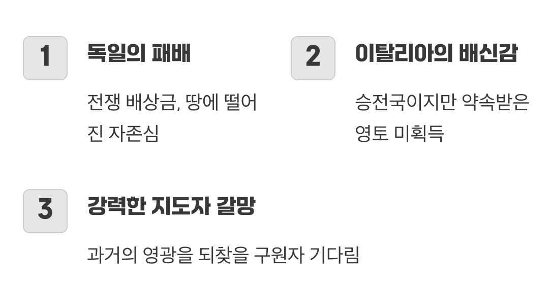 이탈리아는 조금 달랐습니다. 그들은 승전국이었지만, 전쟁이 끝난 뒤 연합국으로부터 약속받았던 영토를 제대로 받지 못했습니다. 수많은 희생을 치르고도 아무것도 얻지 못했다는 ‘상처뿐인 영광’은 국민들에게 깊은 배신감을 안겨주었습니다. 이처럼 독일의 패배감과 이탈리아의 배신감은 ‘우리의 위대했던 과거를 되찾아 줄 강력한 지도자’를 애타게 기다리는 마음의 불씨가 되었습니다.