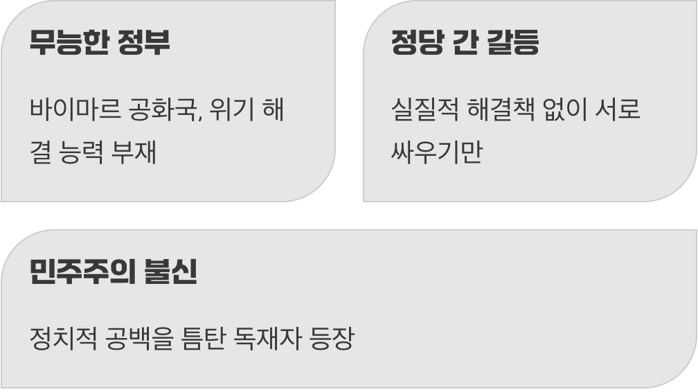 경제가 무너지자 정치도 함께 흔들렸습니다. 당시 독일의 ‘바이마르 공화국’과 이탈리아의 정부는 이 거대한 위기를 해결할 능력이 없었습니다. 여러 정당들이 서로 싸우기만 할 뿐, 굶주리는 국민들을 위한 실질적인 해결책을 내놓지 못했죠.