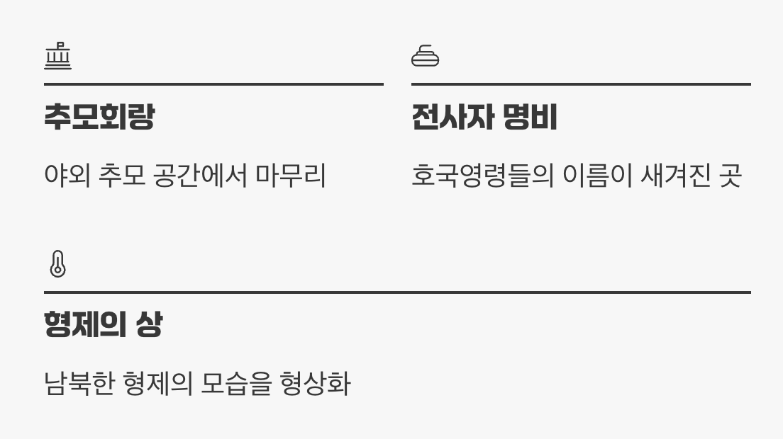 이름 석 자만 남긴 채 돌아오지 못한 젊은 영혼들의 흔적 앞에서, 우리는 숙연한 마음으로 감사를 표하게 됩니다. 또한, 전쟁터에서 서로를 의지했던 남북한 형제의 모습을 형상화한 '형제의 상'은 이 전쟁이 누구를 위한 것이었는지, 그리고 우리가 왜 다시는 이 땅에 비극이 반복되지 않도록 노력해야 하는지를 말없이 보여주는 강력한 메시지를 전달합니다.