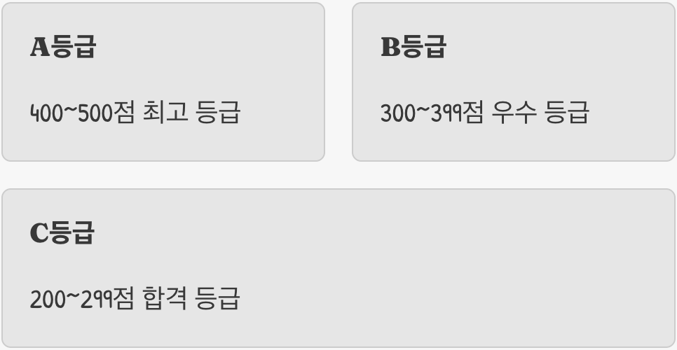 이 시험의 가장 큰 장점은 성적표처럼 내 실력을 등급으로 알려준다는 점입니다. 500점 만점을 기준으로 내가 획득한 점수에 따라 등급이 결정됩니다. 꿈의 점수인 400점부터 500점 사이를 받으면 최고 등급인 A등급을 받게 됩니다. 실수가 조금 있어도 80% 이상만 맞추면 되니, 만점을 받아야 한다는 부담감을 내려놓고 편안하게 도전하셔도 좋습니다.