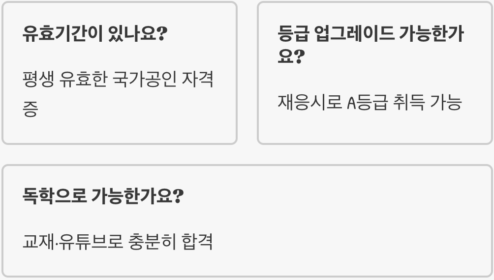 만약 조금 실수를 해서 점수가 깎였다면 어떻게 될까요? 걱정 마세요. 300점에서 399점 사이는 B등급, 200점에서 299점 사이는 C등급을 받습니다. C등급만 받아도 국가공인 자격증이 발급됩니다. 즉, 200점 미만으로 떨어지지만 않으면 누구나 합격의 기쁨을 누릴 수 있다는 뜻입니다. 처음 도전한다면 일단 B등급 이상을 목표로 잡고 시작하는 것이 마음 편한 해결책이 될 수 있습니다.