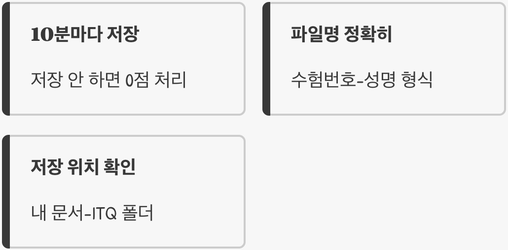 시험 당일 가장 큰 적은 긴장감입니다. 긴장하면 평소에 잘하던 저장도 깜빡하게 됩니다. ITQ 시험은 주기적으로 '저장' 버튼을 누르고 '답안 전송'을 해야 합니다. 아무리 잘 풀었어도 저장이 안 되어 있으면 0점 처리될 수 있습니다. 10분에 한 번씩은 무조건 저장 버튼을 누르는 것을 습관화하세요.