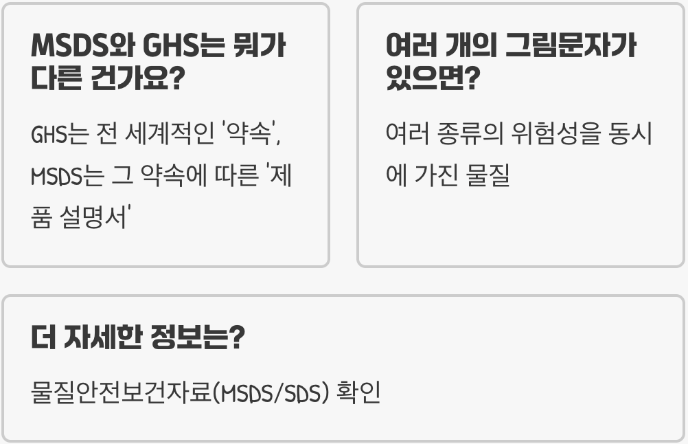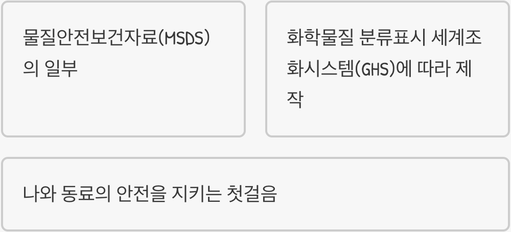 우리가 마주하는 이 그림 표지는 '물질안전보건자료(MSDS)'의 일부로, '화학물질 분류표시 세계조화시스템(GHS)'이라는 국제적인 약속에 따라 만들어졌습니다. 이름은 어렵지만, 내용은 간단합니다. "위험한 화학물질에 대해서는 전 세계가 똑같은 그림으로 경고해서, 사고를 미리 막자!"는 것입니다.