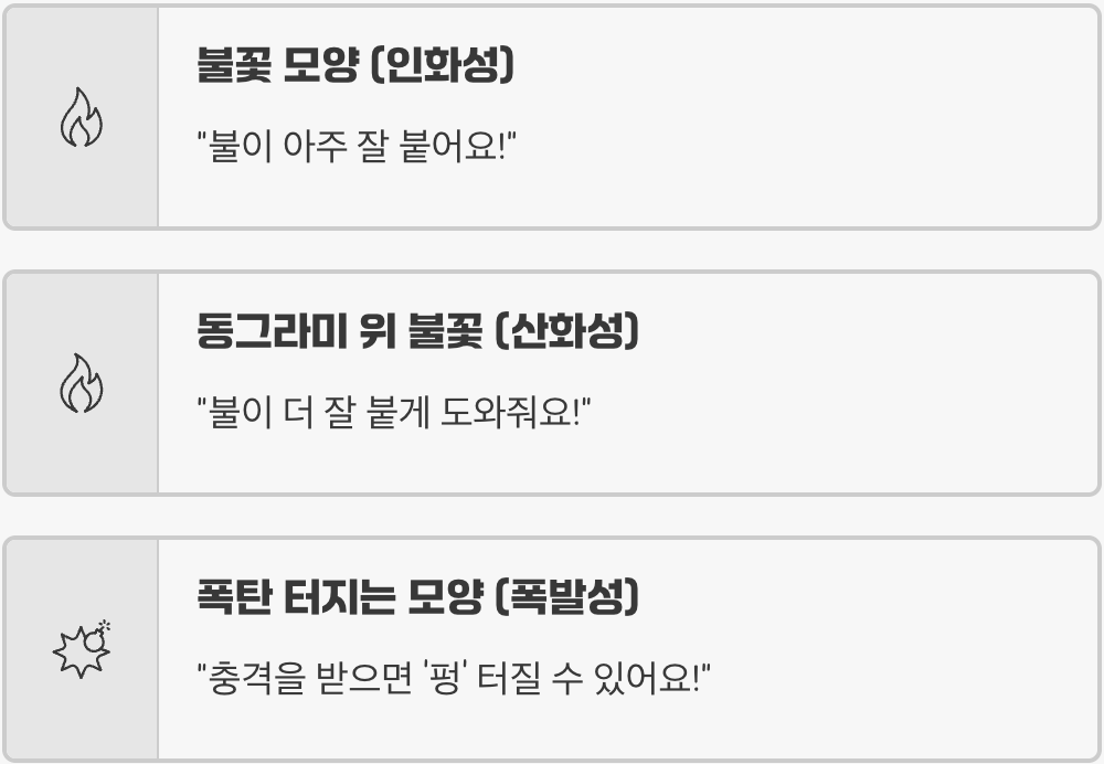 - 동그라미 위 불꽃 (산화성): "불이 더 잘 붙게 도와줘요!" 라는 뜻입니다. 이 물질 자체는 불에 타지 않지만, 주변의 다른 물질이 폭발적으로 타오르도록 돕는 '조력자' 역할을 합니다. 인화성 물질과 함께 두는 것은 불난 집에 기름을 붓는 것과 같으니 절대 금물입니다.