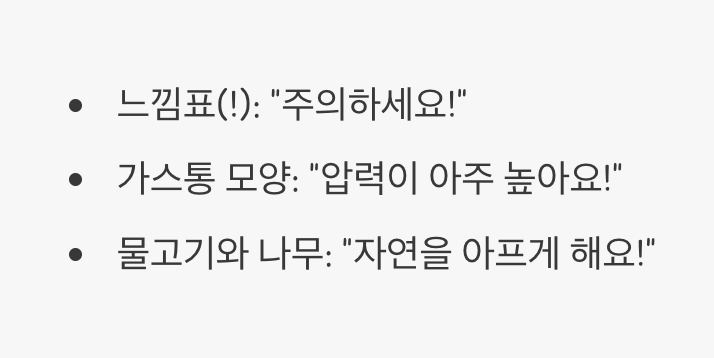- 느낌표 (!): "주의하세요!" 라는 가장 일반적인 경고입니다. 위의 6가지 경우만큼 치명적이지는 않지만, 피부에 자극을 주거나 가벼운 알레르기 반응을 일으킬 수 있는 등 상대적으로 낮은 수준의 위험이 있을 때 사용됩니다.