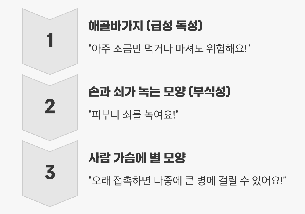 - 사람 가슴에 별 모양 (발암성/호흡기 과민성): "오래 접촉하면 나중에 큰 병에 걸릴 수 있어요!" 라는 무서운 경고입니다. 당장은 괜찮아 보여도, 오랜 시간 노출될 경우 암을 유발하거나, 호흡기 질환, 생식 기능에 문제를 일으킬 수 있는 물질을 나타냅니다.